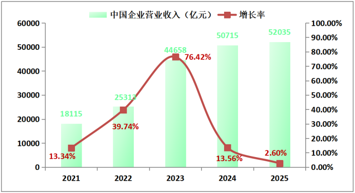 ▲图10 2021-2025年“500强”企业中中国企业总营业收入(亿元)及增长率情况
