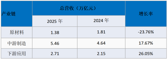 统计结果显示,2025年500强企业中,原材料企业的总营业收入为1.38万亿元,比上年的1.81万亿元减少0.43万亿元,下降23.76%;中游制造企业的总营业收入为5.46万亿元,比上年的4.64亿元增加0.82万亿元,增长17.67%;下游应用企业的总营业收入为2.71万亿元,比上年的2.15万亿元增加0.56万亿元,增长26.05%(见表5)。