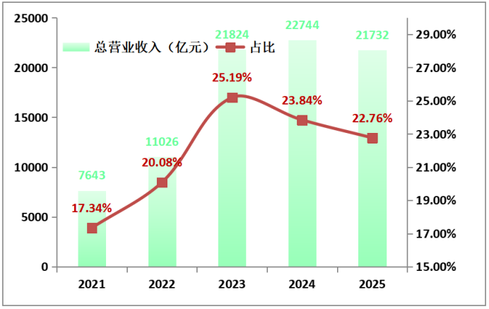 一是企业总营业收入上,2025年500强企业中,储能企业总营业收入为2.17万亿元,比上年的2.27万亿元小幅下降0.10万亿元;其总营业收入占比为22.76%,比上年的23.84%小幅下降0.08个百分点(见图12、13)。