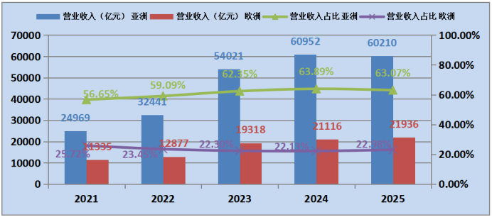 ▲图8 2021-2025年“500强”企业中亚洲、欧洲企业营业收入及其占比对比