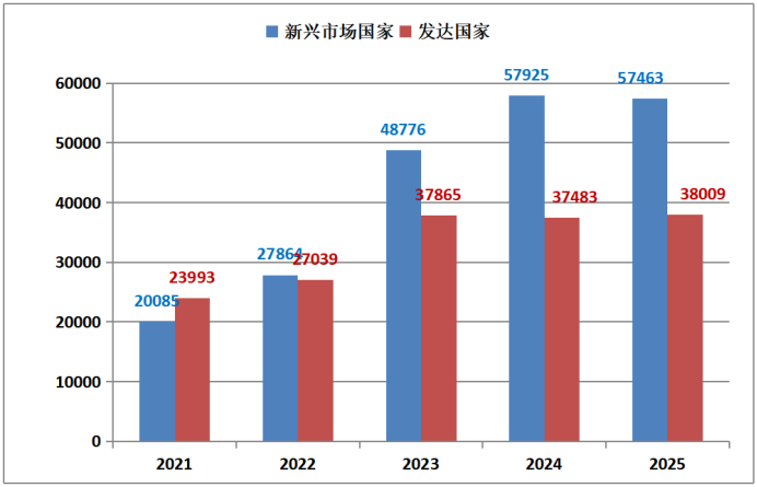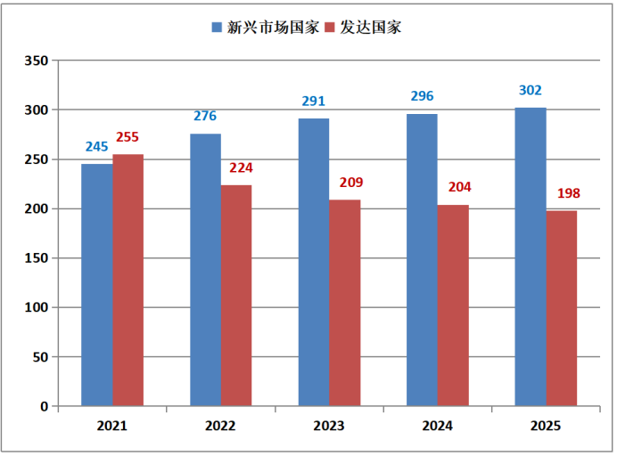 ▲图4 2021-2025年“500强”企业中新兴市场国家与发达国家企业总营业收入(亿元)