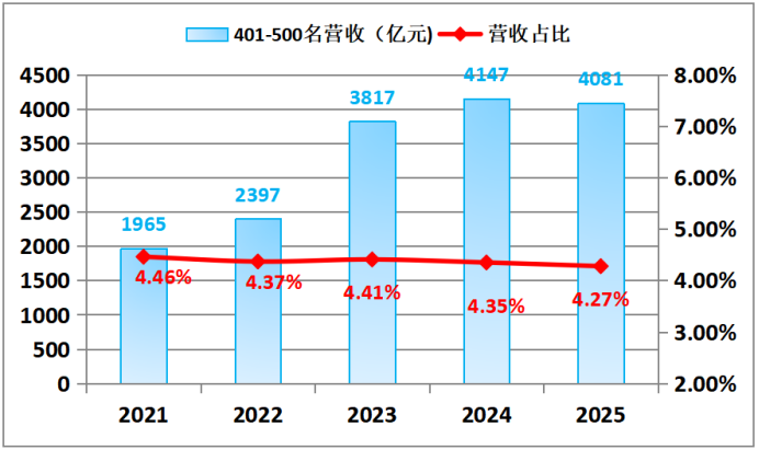 401-500名企业的总营业收入为4081亿元,比上年的4147亿元减少66亿元,下降1.59%;其营业收入占比为4.27%,比上年的4.35%减少0.08个百分点(见图17)。