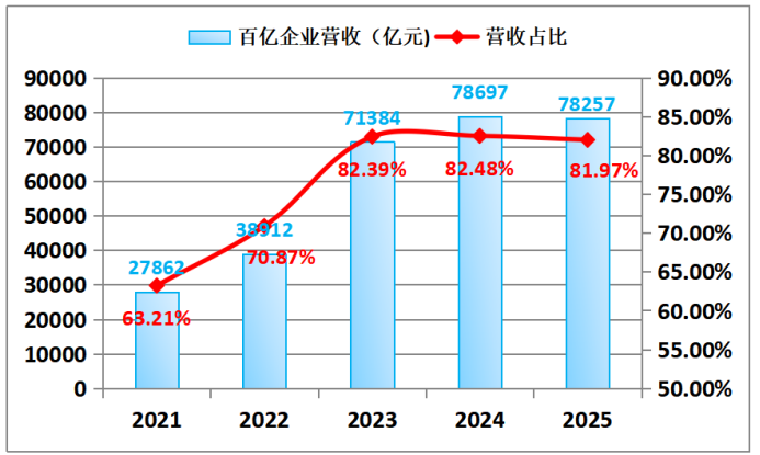 ▲图16 2021—2025年“500强”中百亿企业营收及营收占比情况