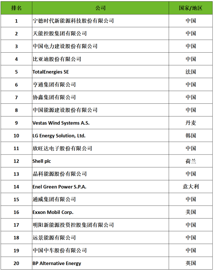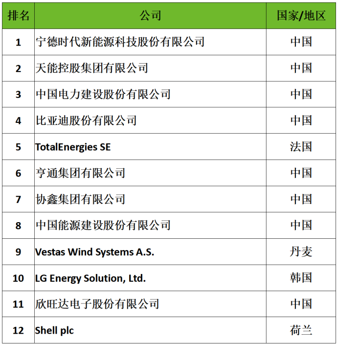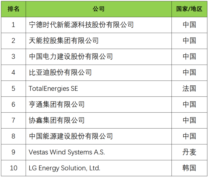 三是前十的企业中,亚洲有宁德时代、天能控股、中国电建、亨通集团、比亚迪、协鑫集团、中国能建和LG Energy Solution等8家企业,欧洲有TotalEnergies 和Vestas 等2家企业(见表1)。