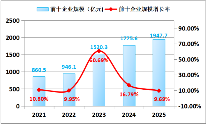 一是企业平均规模上,前十企业平均规模为1947.7亿元,比上年的1775.6亿元增加172.1亿元;企业平均规模增长9.69%,增幅比上年的16.79%减少7.1个百分点(见图14)。