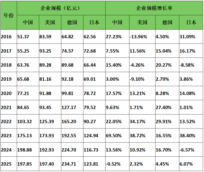 表3 2016-2025年“500强”企业中中美德日企业规模及增长情况