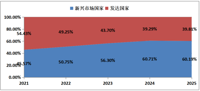 ▲图5 2021-2025年“500强”企业中新兴市场国家与发达国家企业营收占比