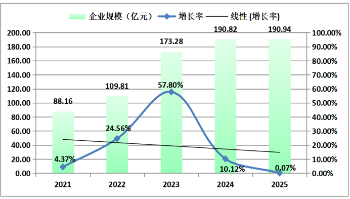 二是企业平均规模增幅持续下降。统计结果显示,2025年500强企业的平均规模为190.94亿元(见图2),比上年的190.82亿元小幅增加0.12亿元,增长0.07%,增幅比上年度的10.12%大幅减少10.05个百分点,增幅连续两年大幅下降。