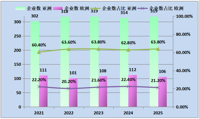 ▲图7 2021-2025年“500强”企业中亚洲、欧洲企业数及其占比对比