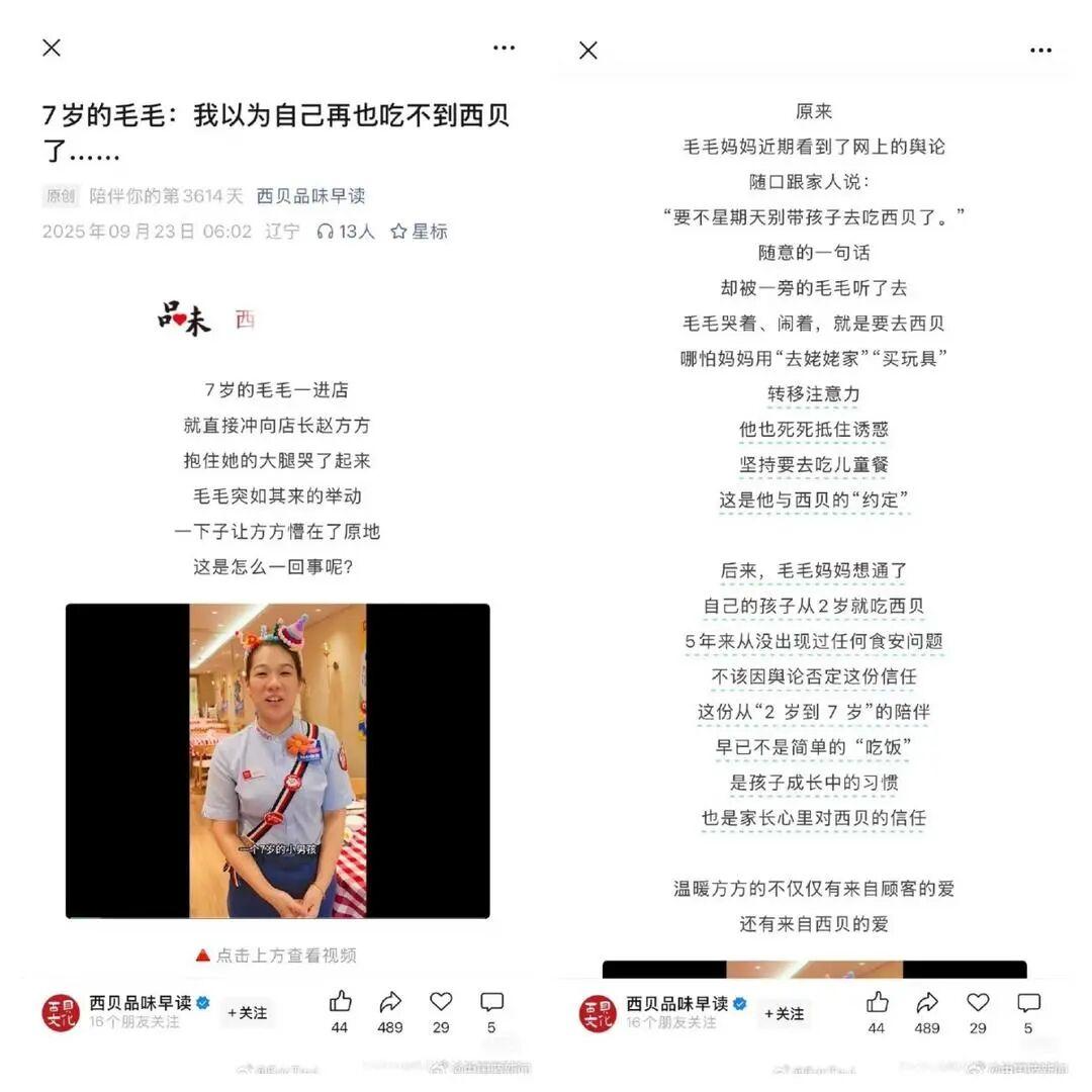 9月23日,名为“西贝风味早读”的公众号,发布文章《7岁的毛毛:我以为我再也吃不到西贝了……》。文章以7岁儿童毛毛的视角,讲述了毛毛从2岁起开始吃西贝,妈妈因为最近的新闻不让毛毛再去,毛毛哭着、闹着,哪怕妈妈用玩具“诱惑”,也要遵守与西贝的“约定”,最后妈妈想通了“不该因舆论否定这份信任”。