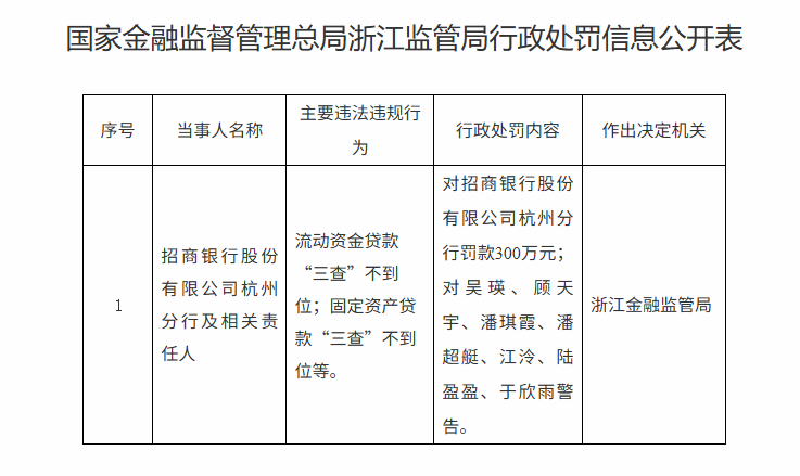 今日,国家金融监督管理总局处罚信息显示,招商银行股份有限公司杭州分行因流动资金贷款“三查”不到位;固定资产贷款“三查”不到位等,被浙江金融监管局罚款300万元。同时,对吴瑛、顾天宇、潘琪霞、潘超艇、江泠、陆盈盈、于欣雨等相关责任人警告处理。