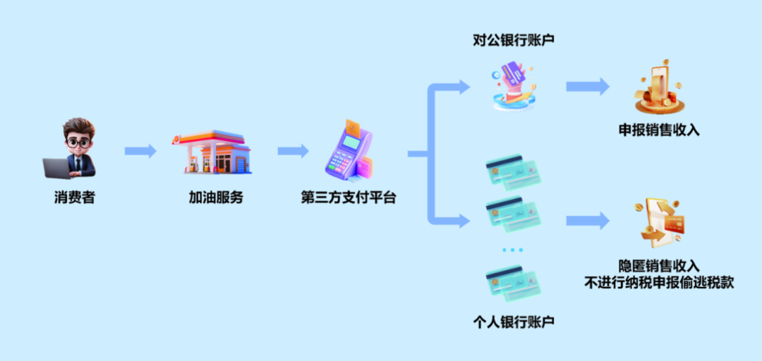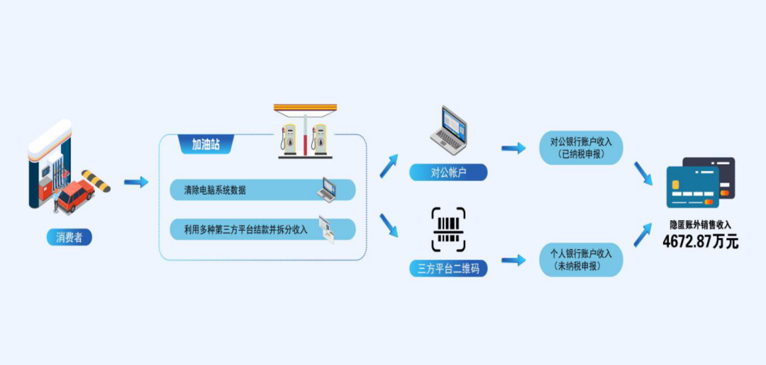 检查人员逐笔梳理第三方支付平台的交易流水,结合该加油站对公账户银行流水和申报数据,锁定与销售收入相关的资金,查实隐匿销售收入达1085.75万元。面对事实证据,该加油站负责人最终承认相关违法行为的事实:为少申报纳税,其通过使用第三方收款平台收取加油款,结算后转至个人银行账户,款项未进入对公账户申报纳税。该加油站负责人表示积极配合税务机关检查工作,如实提供相关证据资料。