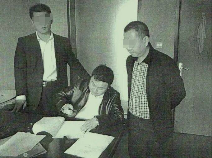 乐山市商业银行两名工作人员与假冒担保方银行工作人员的殷学明(中)在“面签”现场。受访者提供 资料图