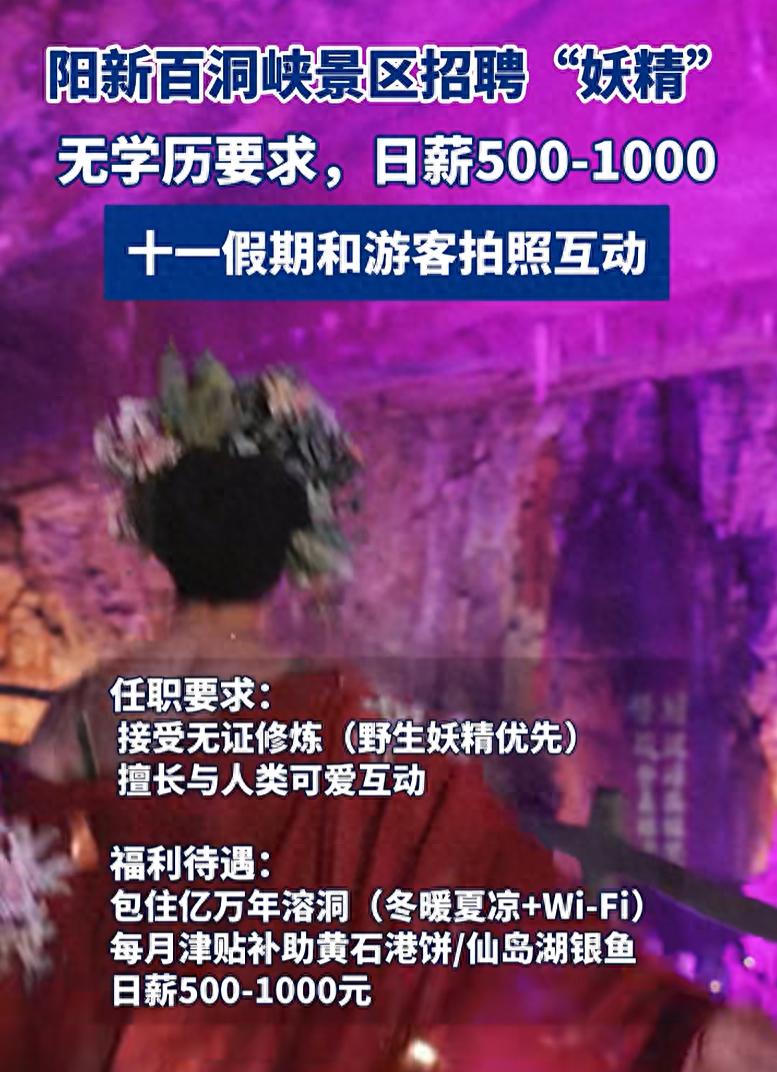 根据招聘信息,“妖精”一职无学历要求,日薪500—1000元,负责“十一”假期和游客拍照互动。任职要求方面,需接受无证修炼,并备注“野生‘妖精’优先”,擅长与人类可爱互动。福利待遇包括包住亿万年溶洞,冬暖夏凉有Wi-Fi,每月津贴补助黄石港饼/仙岛湖银鱼。