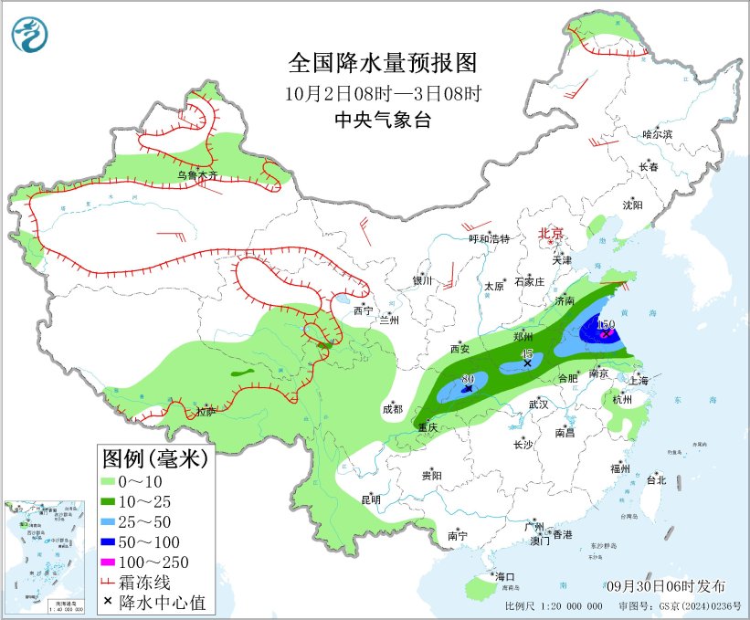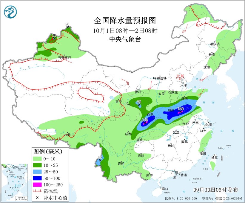 10月1日8时至2日8时,新疆北部、甘肃东部、宁夏南部、陕西中南部、河南、山东中南部、湖北北部、苏皖北部、四川盆地中东部、云南西部等地部分地区有中到大雨,其中,陕西南部、山东南部、河南中南部、苏皖北部、四川盆地东北部等地部分地区有暴雨或大暴雨(100~150毫米)。新疆北部、内蒙古、辽东半岛、山东半岛等地部分地区有4~6级风,其中,新疆北部部分地区有7~8级风。