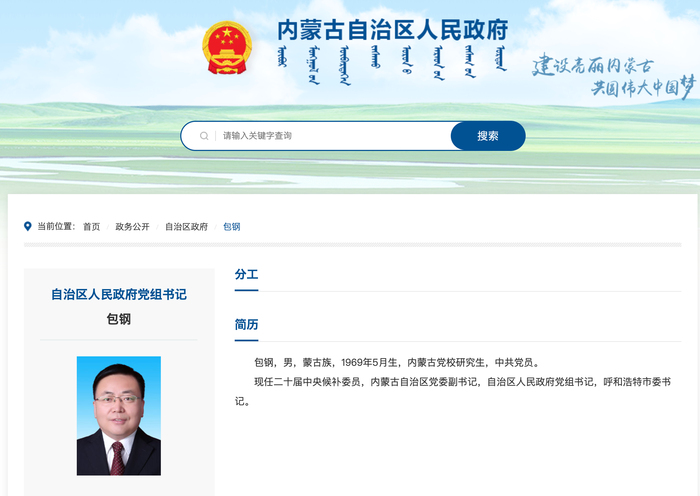 内蒙古自治区人民政府网站更新显示,包钢现任二十届中央候补委员,内蒙古自治区党委副书记,自治区人民政府党组书记,呼和浩特市委书记。
