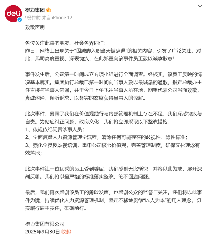 9月30日,@得力集团 发布致歉声明: