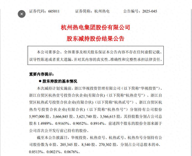 9月30日,杭州热电发布股东减持股份结果公告,公司之前的第四至第七大股东“清仓式”减持接近完成。其中第四大股东浙江华视投资管理有限公司(简称“华视投资”)已清仓完毕,浙江自贸区杭热壹号投资合伙企业(有限合伙)(简称“杭热壹号”)、浙江自贸区杭热贰号投资合伙企业(有限合伙)(简称“杭热贰号”)、浙江自贸区杭热叁号投资合伙企业(有限合伙)(简称“杭热叁号”)减持后所剩股数也已不多。