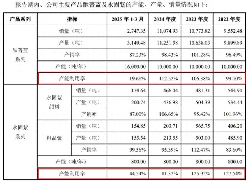 值得一提的是,2025年一季度,申兰华主要产品的产能利用率大幅下降,酞菁蓝从2024年的112.52%降至19.68%,永固紫产能利用率从2024年的81.32%降至44.54%。