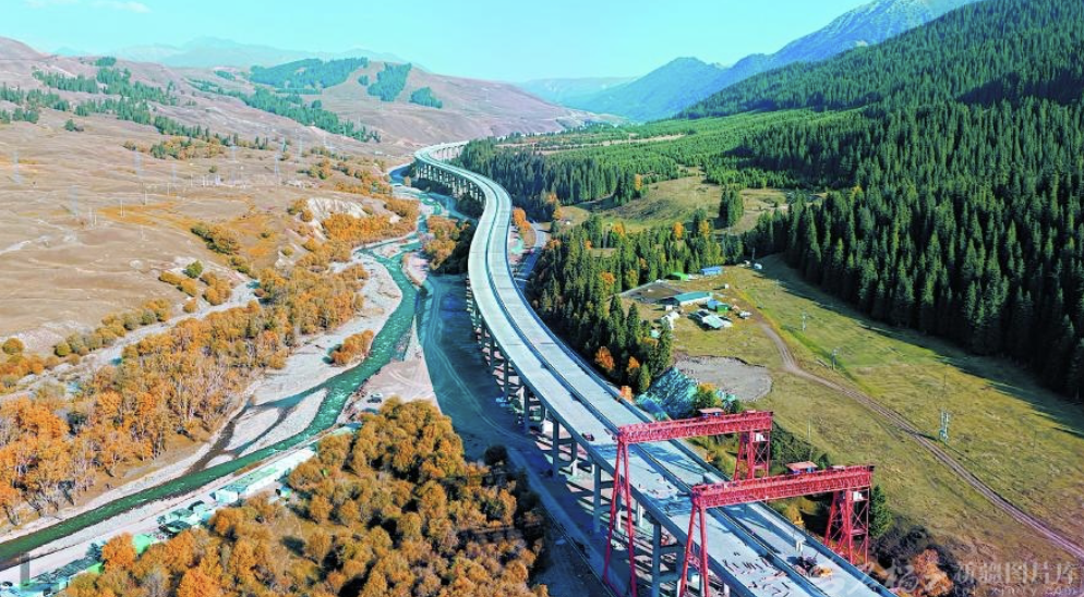 那巴公路第三标段全长13.06公里,全线主要工程就是桥梁,桥梁占比高达60%,设置特大桥、大桥共9座,其中比较有名的就是巩乃斯17号特大桥。“目前,全线桥梁架设施工已完成总工程量的96%,巩乃斯17号特大桥计划9月底前完成架梁施工。”该标段副经理王飞说。