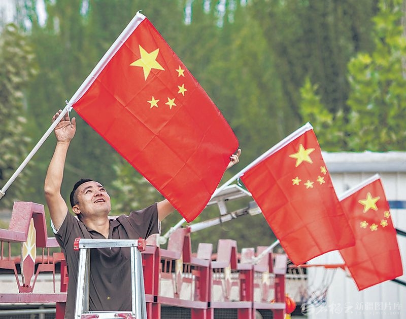 9月18日,泽普县波斯喀木乡库其村村干部悬挂国旗、彩旗,拉横幅,喜迎自治区成立70周年。张昀摄