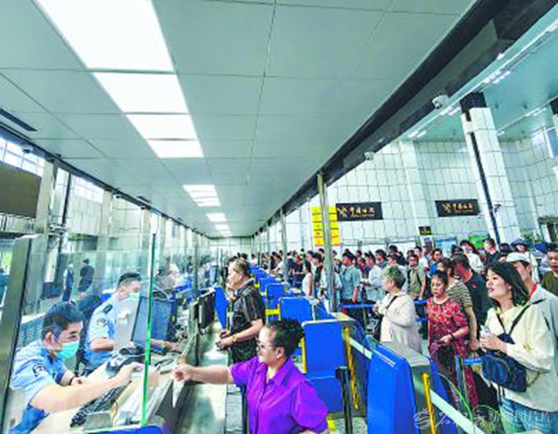 6月25日,商家和游客在中国(新疆)自由贸易试验区霍尔果斯片区边检大厅办理通关手续。 石榴云/新疆日报记者周鹏摄