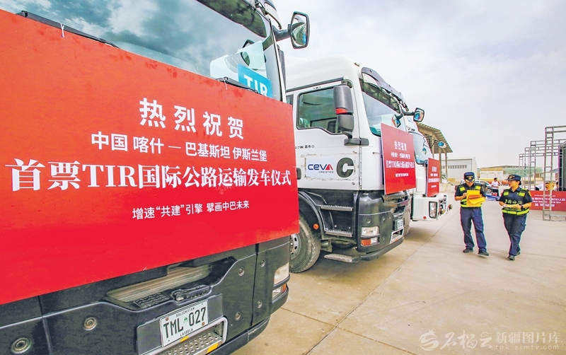 海关工作人员在喀什远方国际物流港查验即将启程的货运车辆(2023年8月22日摄)。 石榴云/新疆日报记者蔡增乐摄