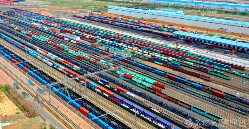 阿拉山口站编组场内停靠待发的中欧班列及其他出入境货运列车(2023年8月24日无人机摄)。宋玉龙摄