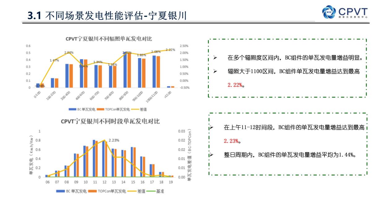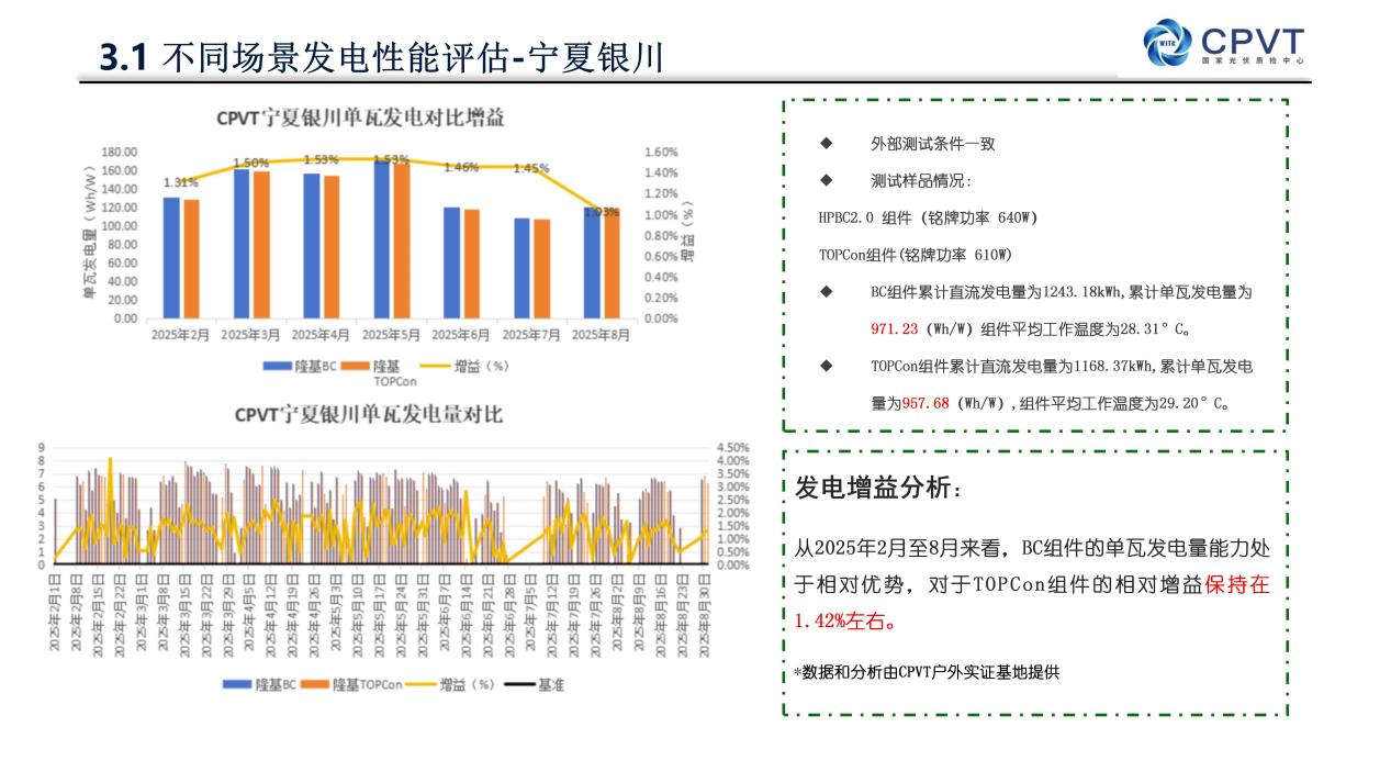 此外,从CPVT银川户外实证基地的数据可以发现,“三防”组件的单瓦发电量(Wh/kWp)也远优于TOPCon组件,较TOPCon组件的相对增益可达1.42%左右。