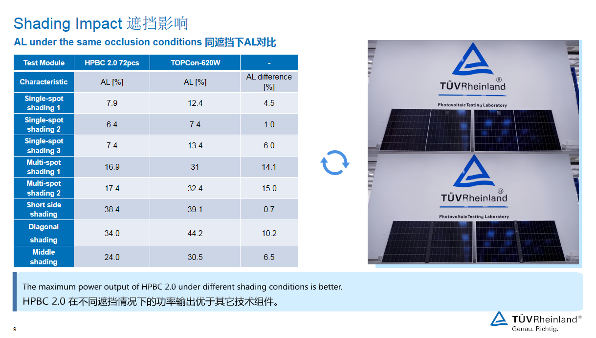 TÜV莱茵的数据证明,采用 HPBC 2.0 技术的隆基 “三防” 组件无论在单点遮挡、多点遮挡、斜边遮挡的情况下,功率损失均优于 TOPCon 组件,因此隆基 HPBC 2.0 的组件获得了莱茵抗阴影A+级认证。