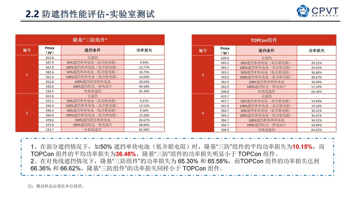 结果显示,“三防”组件在模拟鸟粪和积灰遮挡的情况下,功率损失较TOPCon组件降低6%,在模拟电线杆等斜对角遮挡的情况下,功率损失较TOPCon组件降低10%。