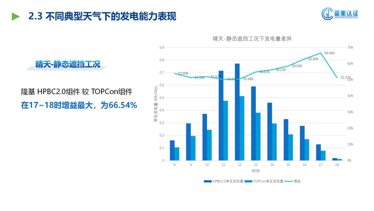 在晴天有遮挡工况下,隆基HPBC 2.0组件较TOPCon组件在17~18时增益最大,为66.54%。