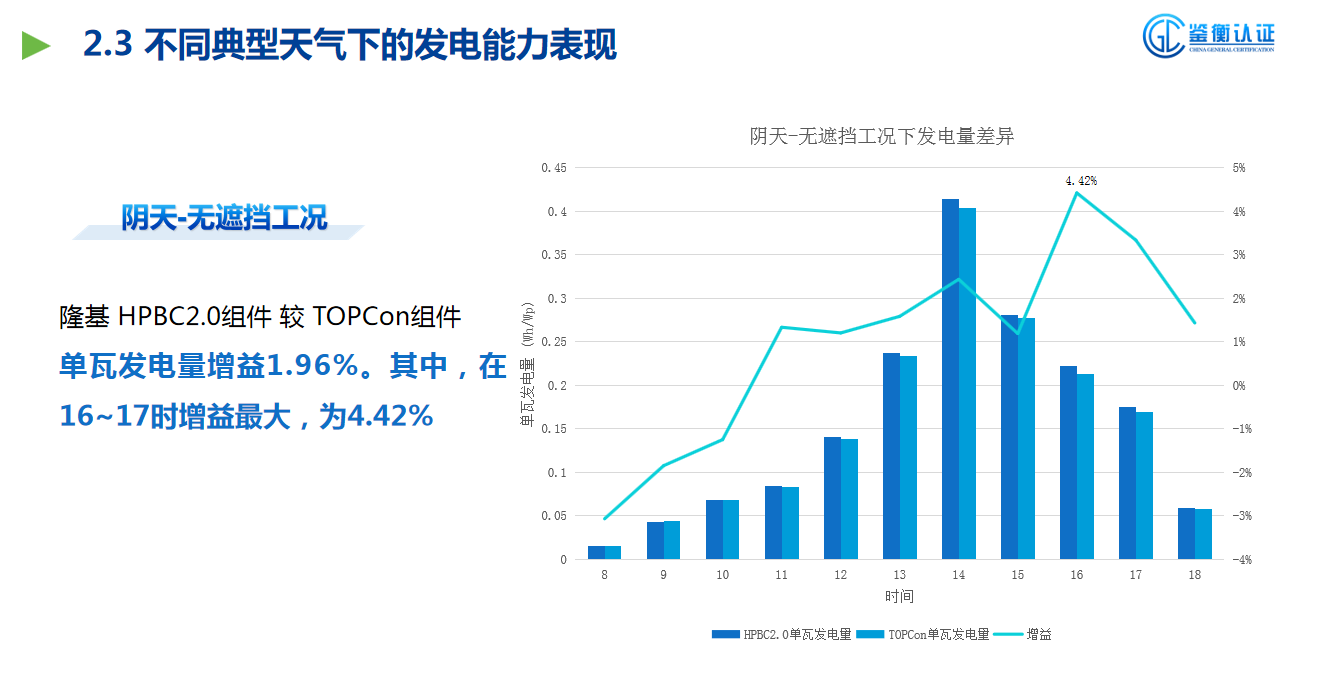 特别值得强调的是,在阴天无遮挡工况下,隆基HPBC 2.0的组件较TOPCon单瓦增益达到了1.96%,其中在16~17时增益最大,达到了4.42%。
