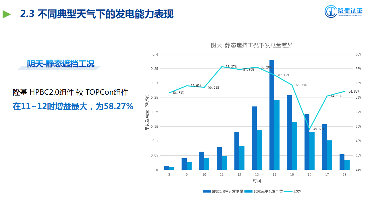 在阴天有遮挡工况下,HPBC 2.0的组件较TOPCon组件在11~12时的增益更是高达58.27%。