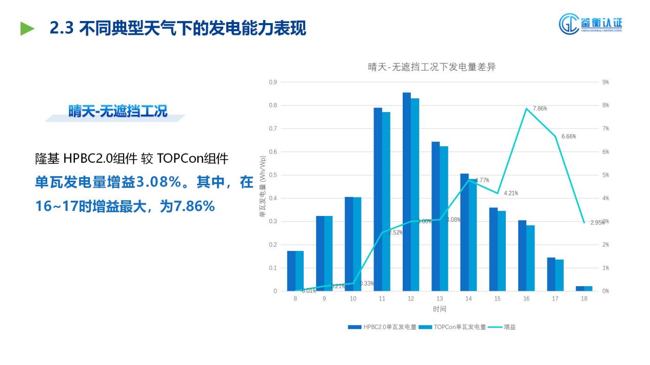 在晴天无遮挡工况下,隆基HPBC 2.0组件较 TOPCon组件单瓦发电量增益3.08%。其中,在16~17时增益最大,为7.86%。