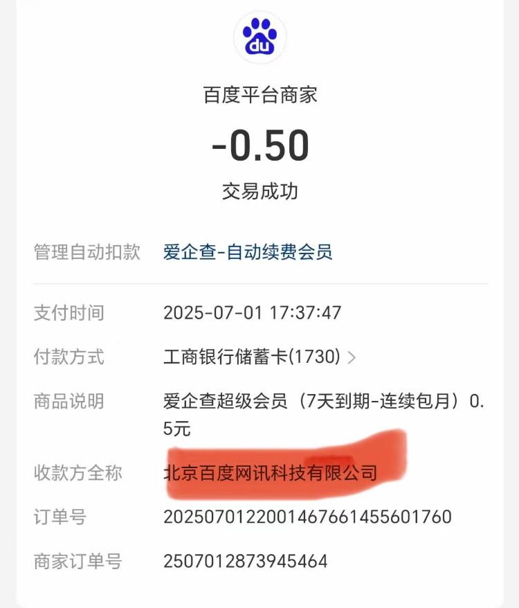 “最让我气愤的是,整个过程我没有收到任何短信、APP推送或邮件提醒。”韦先生展示的支付宝账单显示,扣款方为“北京百度网讯科技有限公司”——爱企查的运营主体。