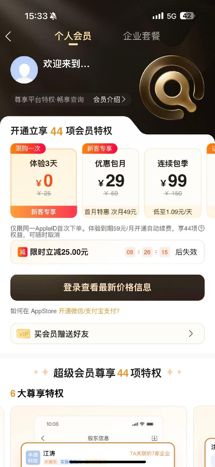 然而,记者在9月15日实测发现,在爱企查在ios手机端个人会员页面有明显红字标注,体验3天0元,新客专享,优惠包月29元,连续包季99元,在此板块下方,有行字体略小且颜色为浅灰色的字体显示,“仅限同一AppleID 首次下单。体验到期59元/月开通自动续费,享44享权益 ,可随时取消。”