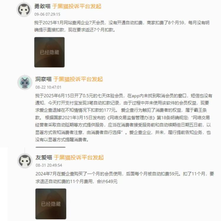 一位昵称为洞察喵的网友表示,“我于2025年6月15日开了0.5元的七天体验会员,在app内未找到取消会员的窗口,短信也没有通知,今天打开支付宝发现3笔自动扣款记录,由于过程中并未使用该软件的会员权益,现要求爱企查退掉在不知情情况下扣款的177元。”