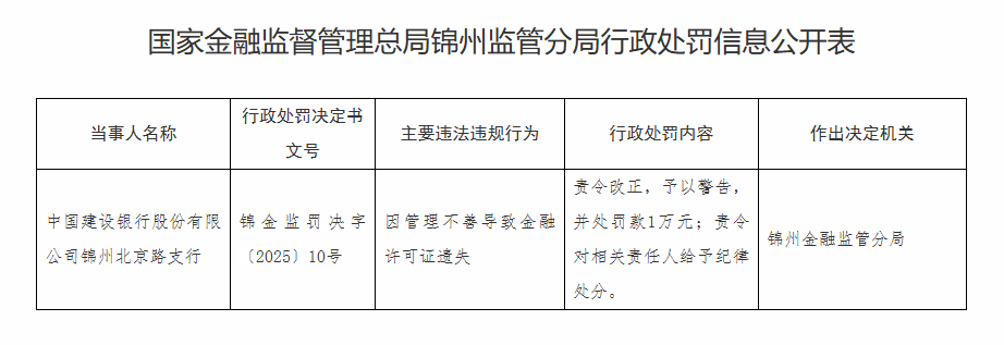 国家金融监督管理总局锦州监管分局行政处罚信息公开表显示,因管理不善导致金融许可证遗失,对中国建设银行股份有限公司锦州北京路支行责令改正,予以警告,并处罚款1万元;责令对相关责任人给予纪律处分。