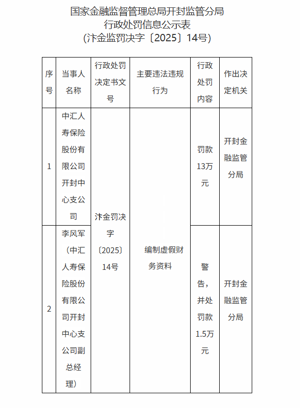 国家金融监督管理总局开封监管分局处罚信息公示,因编制虚假财务资料,中汇人寿保险股份有限公司开封中心支公司被罚款13万元;时任中汇人寿保险股份有限公司开封中心支公司副总经理李风军被警告,并处罚款1.5万元。