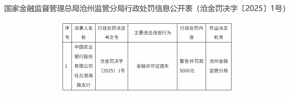 因类似问题被罚的还有农业银行。国家金融监督管理总局沧州监管分局表示,因金融许可证遗失,中国农业银行股份有限公司任丘渤海路支行被警告并罚款5000元。