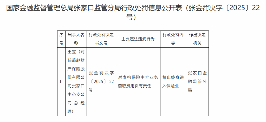 国家金融监督管理总局张家口监管分局公告显示,因对虚构保险中介业务套取费用负有责任,时任燕赵财产保险股份有限公司张家口中心支公司总经理王宝被给予禁止终身进入保险业处罚。