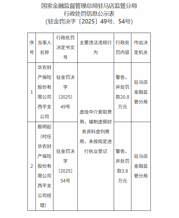 国家金融监督管理总局驻马店监管分局表示,因虚挂中介套取费用,编制虚假财务资料虚列费用,未按规定进行执业登记,华农财产保险股份有限公司西平支公司被警告,并处罚款20.8万元;时任华农财产保险股份有限公司西平支公司经理殷明起被警告,并处罚款3.8万元。