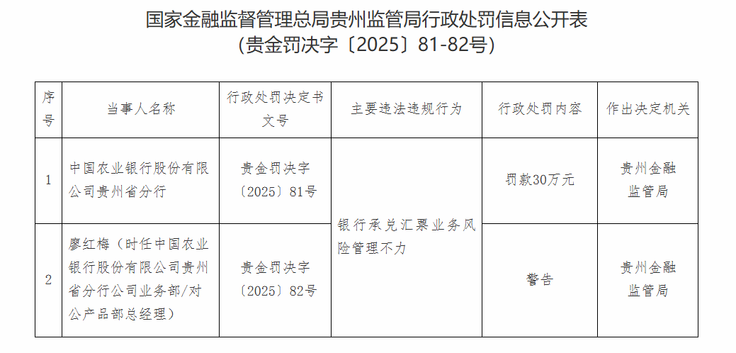 国家金融监督管理总局贵州监管局公布的处罚信息显示,因银行承兑汇票业务风险管理不力,中国农业银行股份有限公司贵州省分行被罚款30万元,时任中国农业银行股份有限公司贵州省分行公司业务部/对公产品部总经理廖红梅被警告。