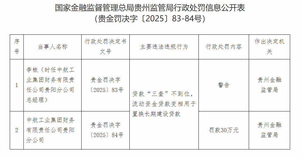 因存在贷款“三查”不到位,流动资金贷款变相用于置换长期建设贷款问题,中航工业集团财务有限责任公司贵阳分公司被罚款30万元,时任中航工业集团财务有限责任公司贵阳分公司总经理李椒被警告。