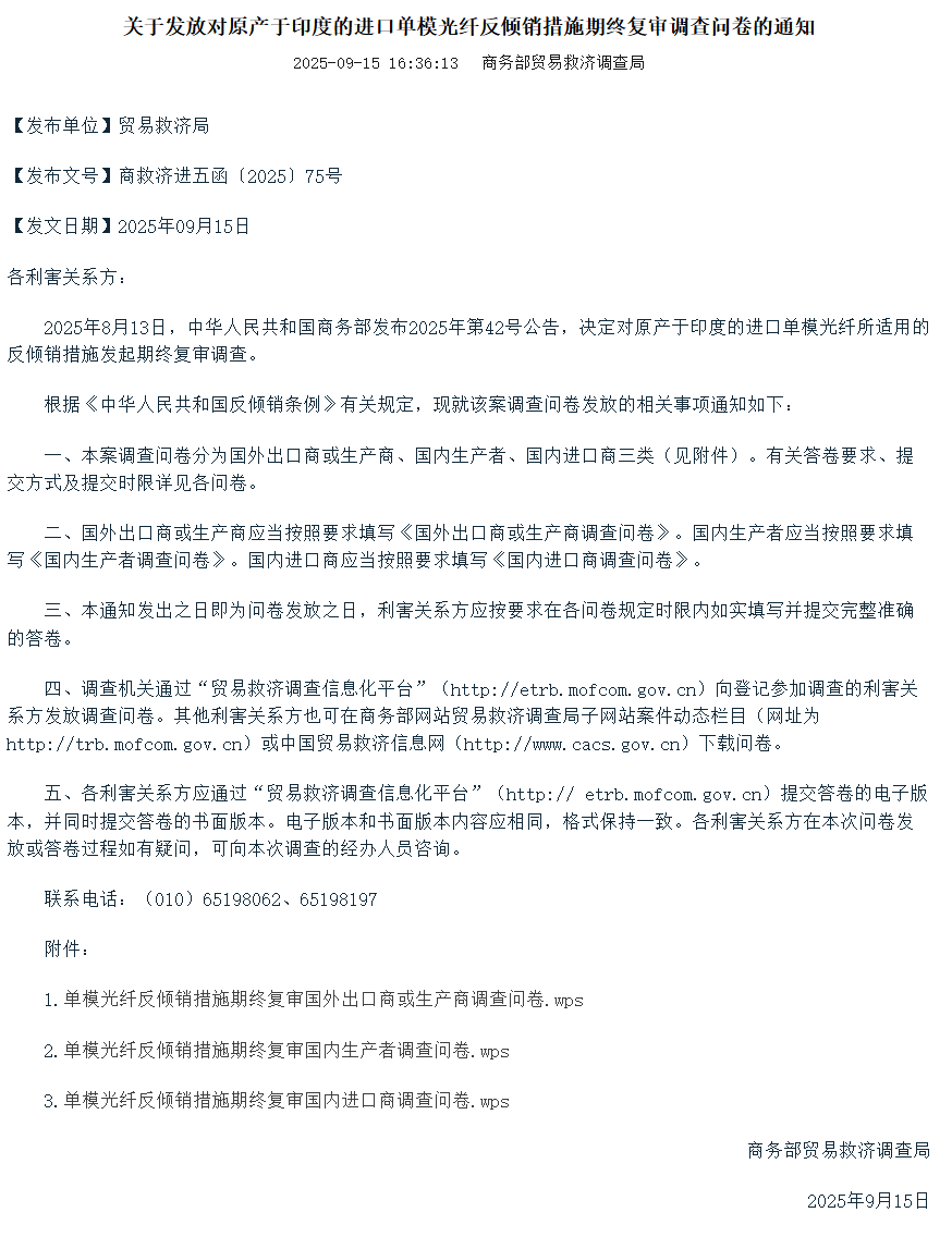 近期,据中国贸易救济信息网显示,中华人民共和国商务部发布2025年第42号公告,决定对原产于印度的进口单模光纤所适用的反倾销措施发起期终复审调查。