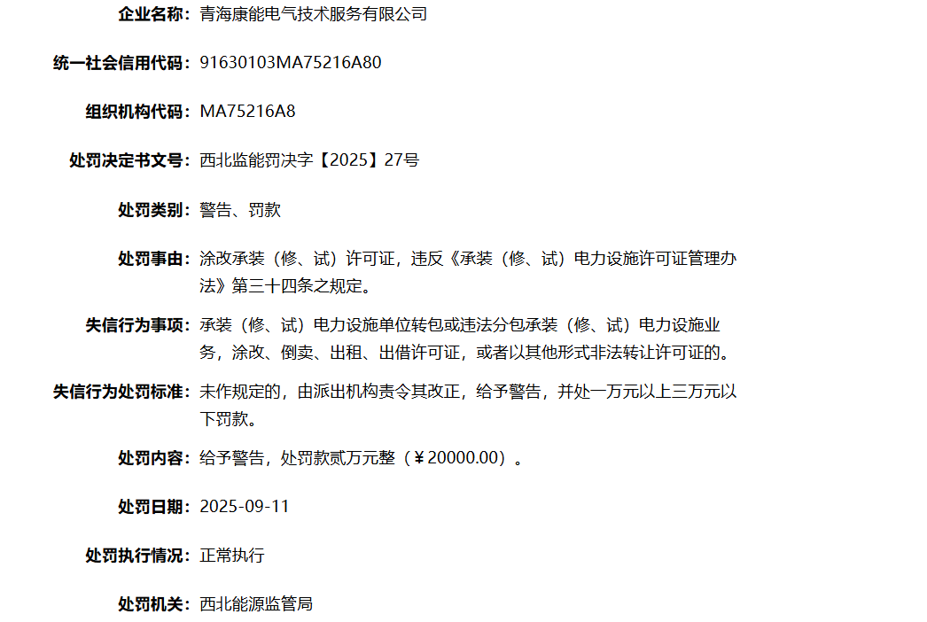 近日,国家能源局资质和信用信息系统信息显示,青海康能电气技术服务有限公司因涂改承装(修、试)许可证,违反《承装(修、试)电力设施许可证管理办法》第三十四条之规定。被西北能源监管局给予警告并处罚款贰万元整(¥20000.00)。