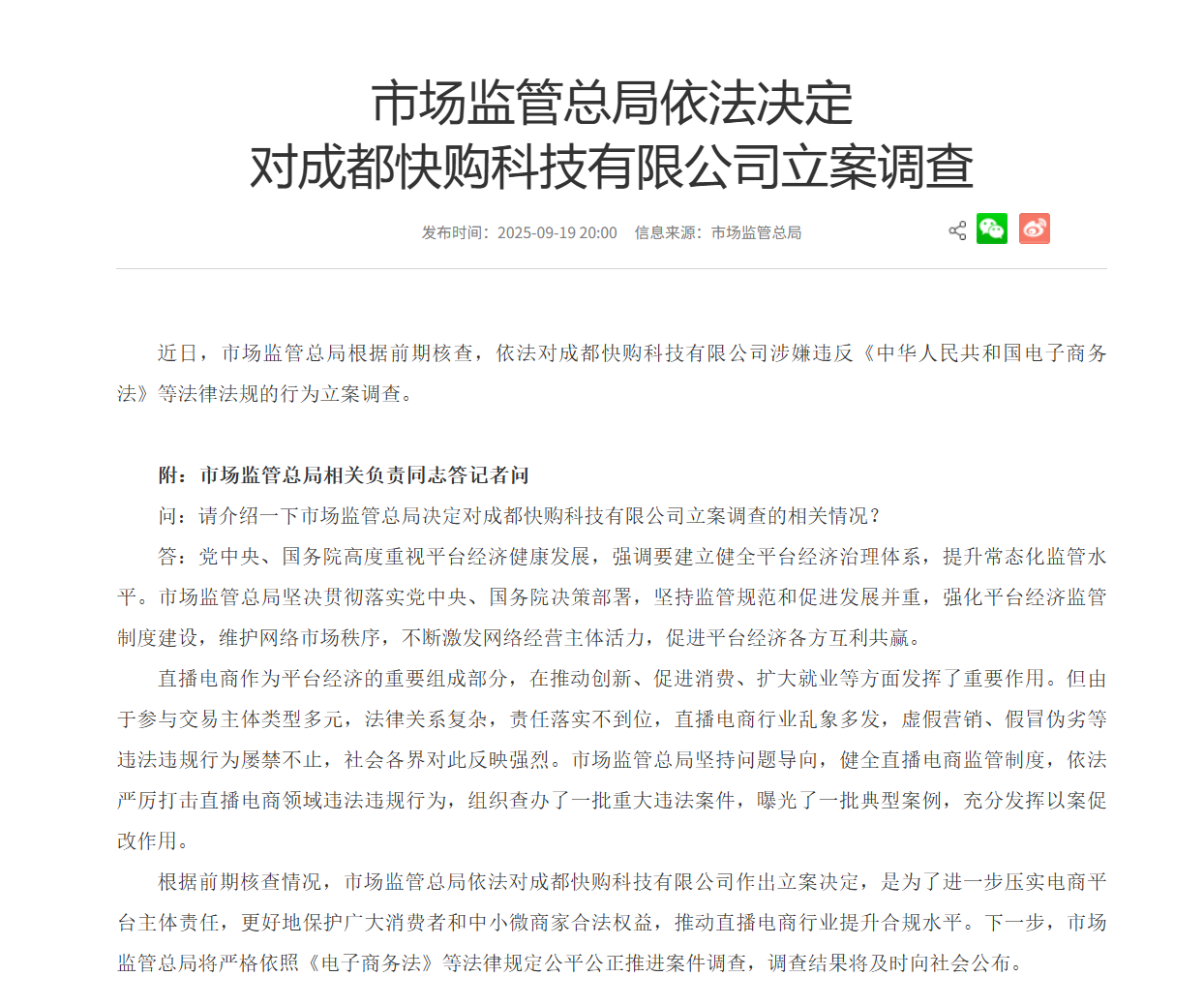 近日,据国家市场监督管理总局官网信息显示,成都快购科技有限公司因涉嫌违反《中华人民共和国电子商务法》等法律法规被市场监管总局立案调查。