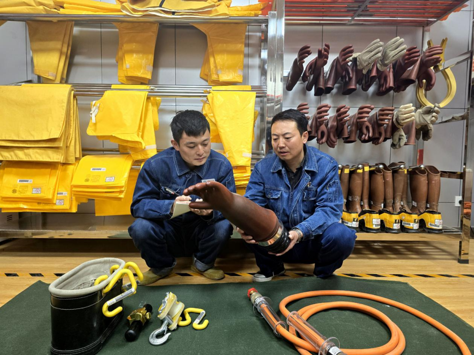 ▲甘肃陇南西和县供电公司配网不停电作业班班长杜瑜向青年员工杜寅讲解安全工器具检查保养知识。