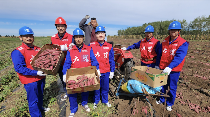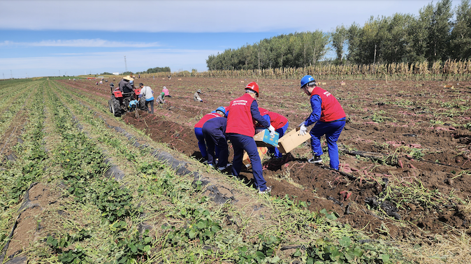 国网沈阳供电公司“大梁”共产党员突击队队员们在地瓜种植园与农户们一同秋收。